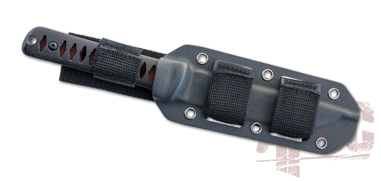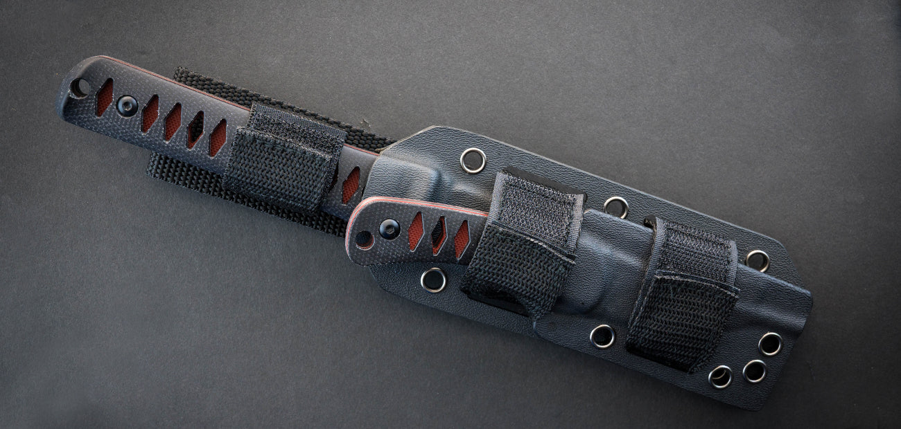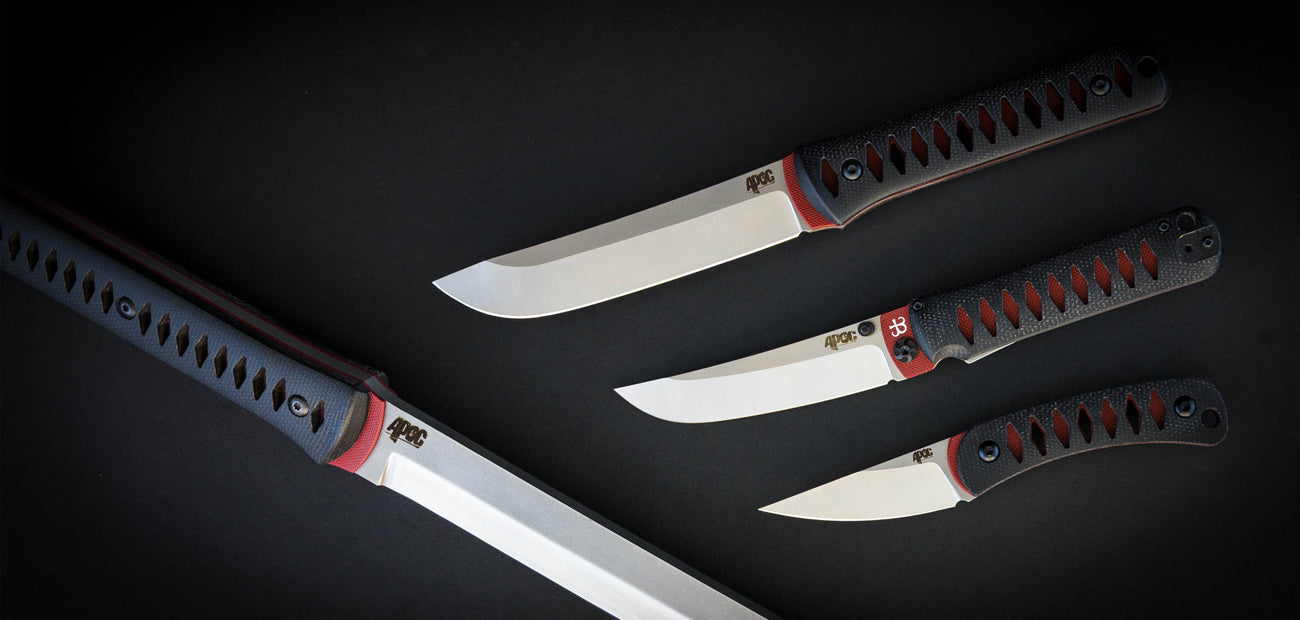 The APOC Breeden Fallout Series merges the design elements of Japanese bravura and the apocalyptic functionality of APOC for a unique edged experience. The geometry of the handles, the blade design, and the embellishments echo the influence of the katana. The cutouts in the black canvas Micarta handle scales mimic the grip tsuka-ito, while the textured red G10 liners reflect dyed same (rayskin). Deviating from our normal black on black no-frills style, APOC steps out with a two-tone color blade finish, making them stand out in the crowd. Like a daisho, our Breeden Fallout Series was engineered to be paired with each other in any combination with their sheaths with their overlapping sheath designs.