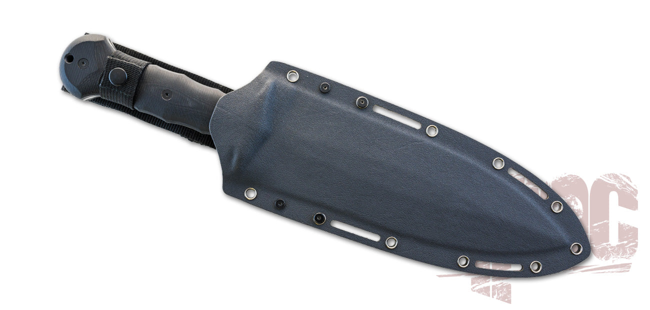 Being called upon for duties that range from hatchet to shovel, the 9 5/8" Titanium coated D2 steel blade's unique shape allows for versatility of function from thrusts, cuts, chops, and piercing. The 5mm thick, full tang construction absorbs the transfer of energy with every task. The G10 handle slabs are rounded to the tang and the notched handle permits a comfortable and secure grip. And for those extreme situations, there is a lanyard hole to help safeguard your swing. The Kydex belt sheath is Molle compatible with a simple snap release.